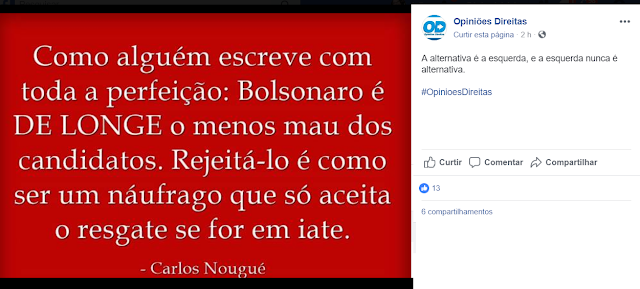 O ponto de partida foi essa publicação acima na página do Opiniões Direitas no Facebook (depois vi repercutida em outras páginas e perfis), com uma apologia do Nougué a Bolsonaro: https://www.facebook.com/opinioesdireitas/photos/a.243335686117324.1073741828.241011239683102/474924509625106/?type=3&theater.